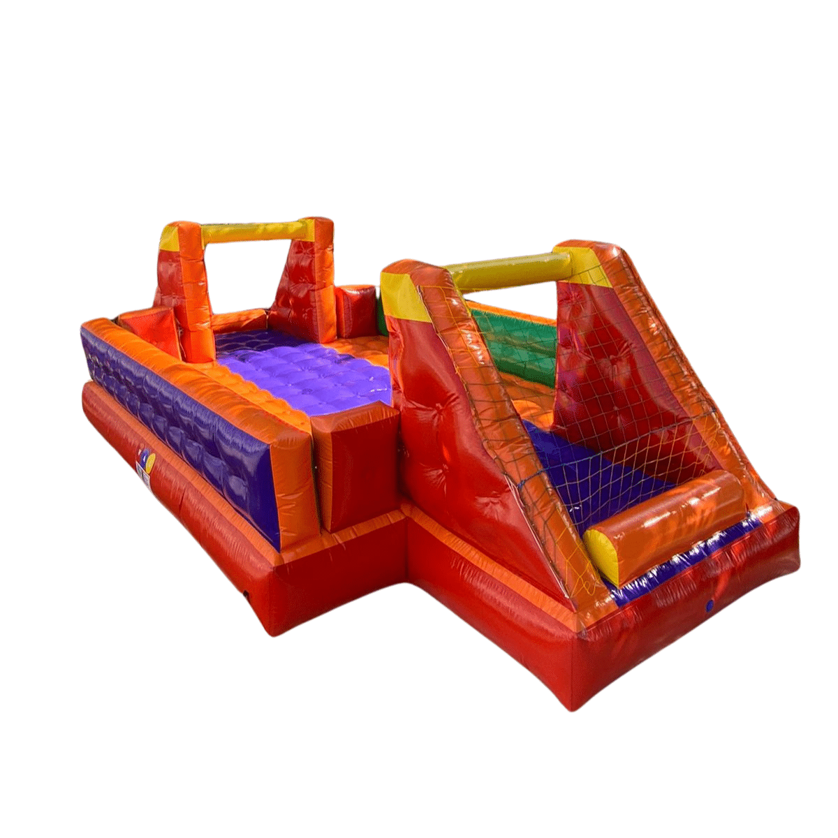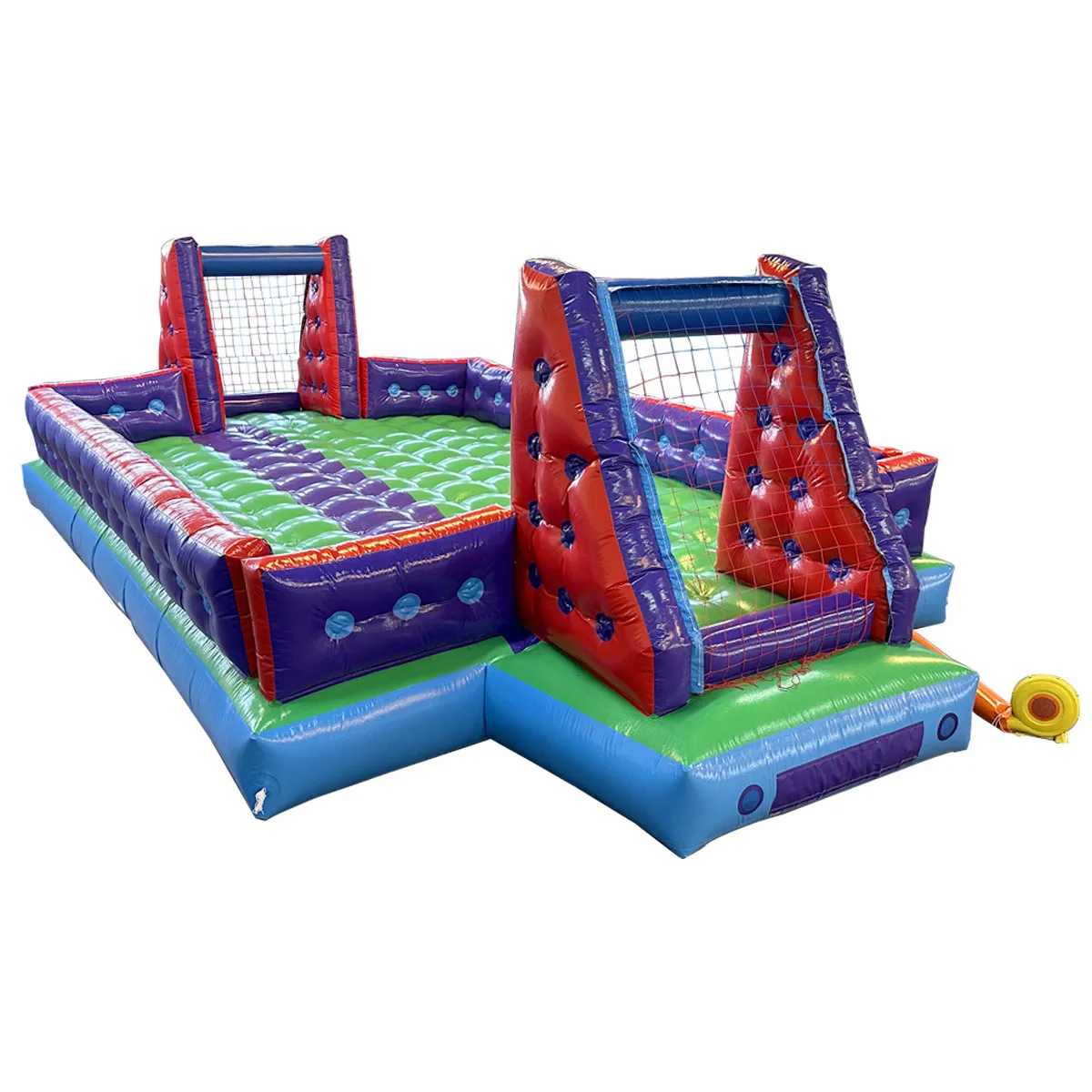 O dobro de entretenimento no mesmo espaço. Um equipamento versátil que combina o clássico futebol de sabão com outra modalidade inflável para não deixar ninguém parado.
